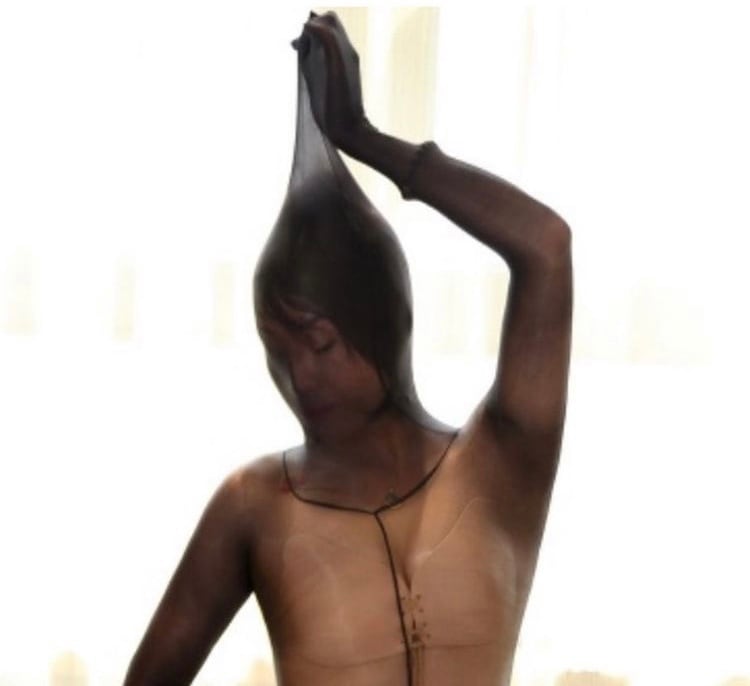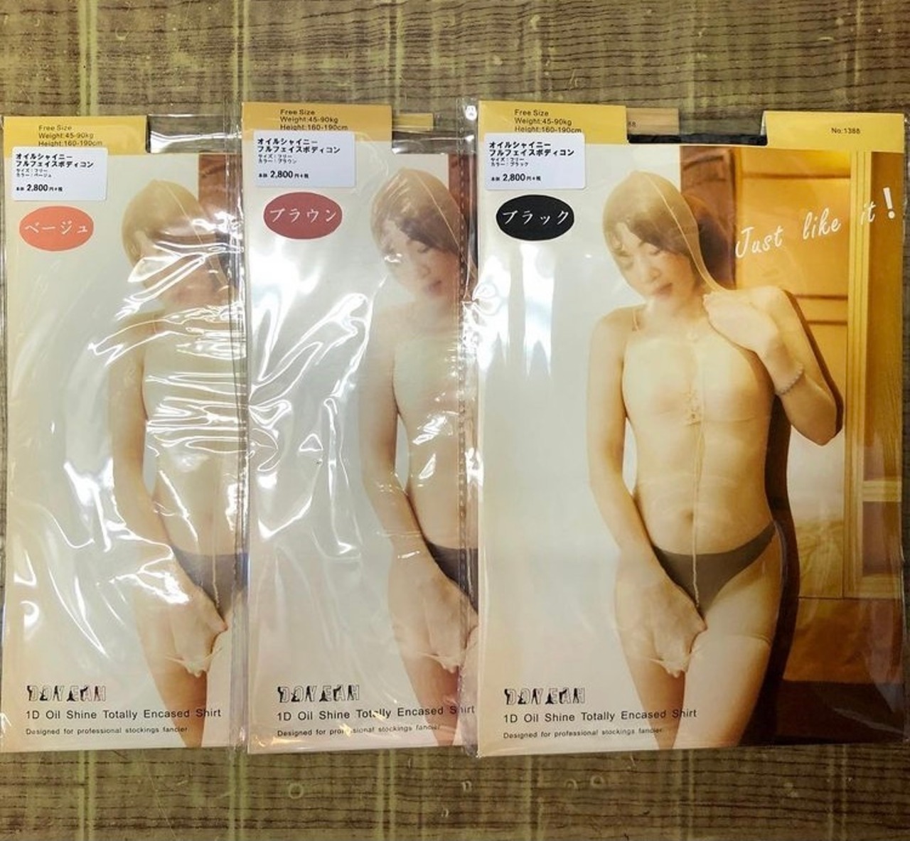 光沢のあるオイリーなストッキング素材が全頭を覆います!